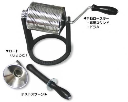 ガスコンロの上にスタンドを安定するように置き、ドラムを正しい位置にセットします。必ず、焙煎する前にロートをはずして下さい。