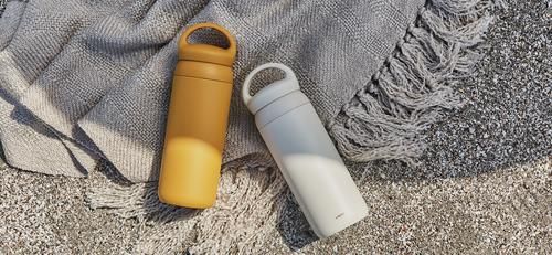 真空二重構造によりドリンクの温度や風味を長くキープし、握りやすい丸みのあるハンドルによって持ち運びがしやすく、散歩や遠出に携帯したくなるデザインです。飲み口はネジなどの突起がなく、やさしい口当たり。氷や熱い飲み物が勢いよく出ることを防ぐ構造で、最後までストレスなく飲みほすことができます。