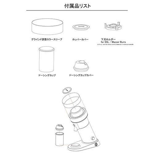 ・付属品:グラインド調整カラースリーブ、ホッパーカバー、下刃ホルダー、ドーシングカップ、ドーシングカップカバー
