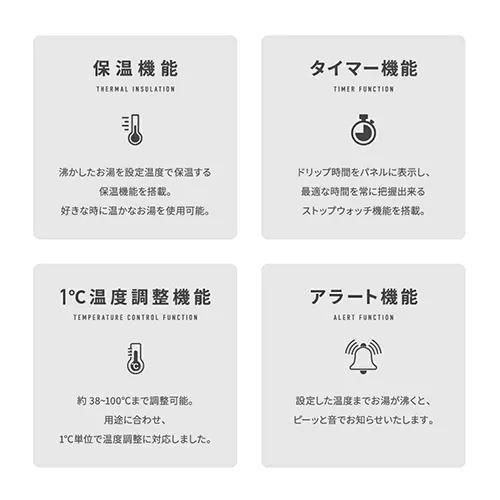 さらに、設定温度に到達時すると音でお知らせするアラート機能や、設定した温度で保温する保温機能、ドリップの時間をパネルに表示して把握出来るストップウォッチ機能など、快適なドリップ体験をサポートする機能も多数搭載。